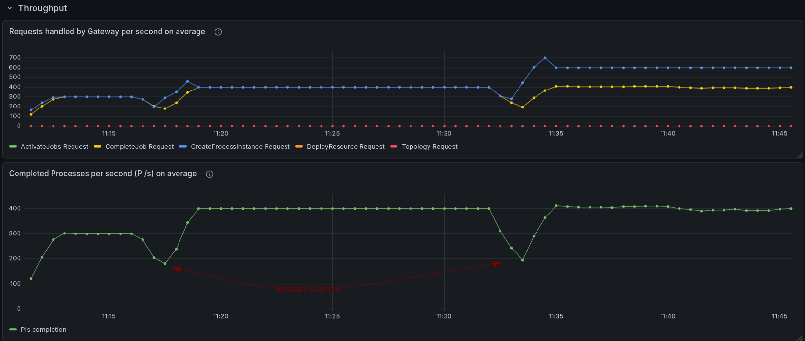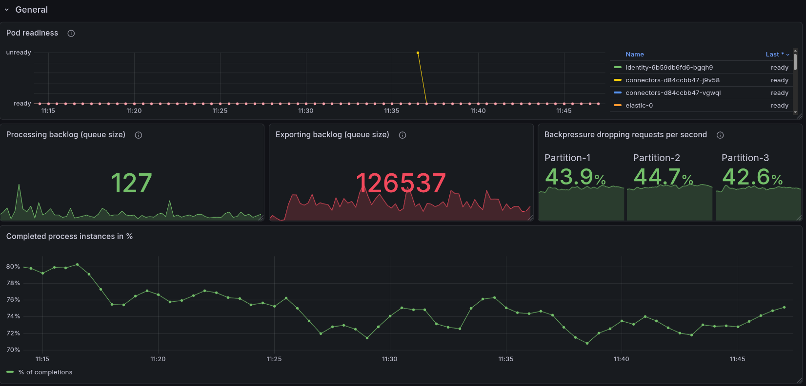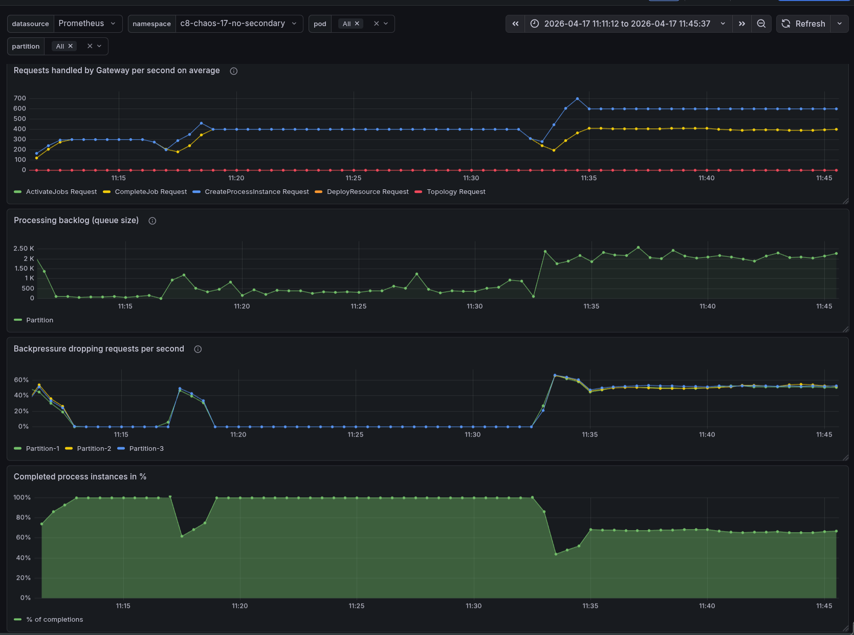 The increased load, first 400 PI/s, later 600 PI/s, produced a bigger processing queue, causing backpressure at the end around ~40-50%. We can see that we are no longer able to complete 100% of the process instances created.