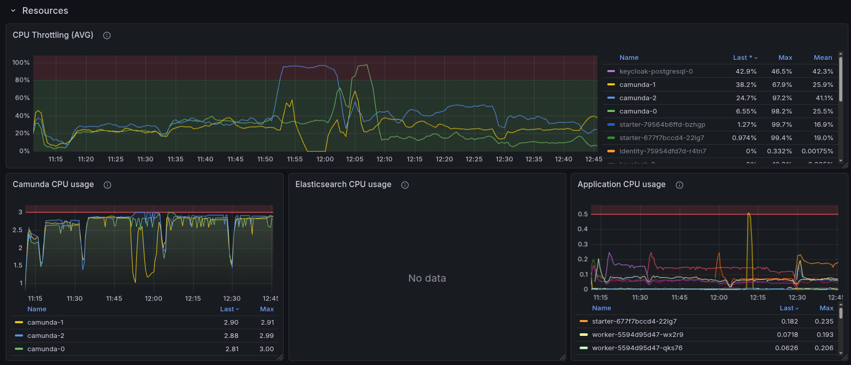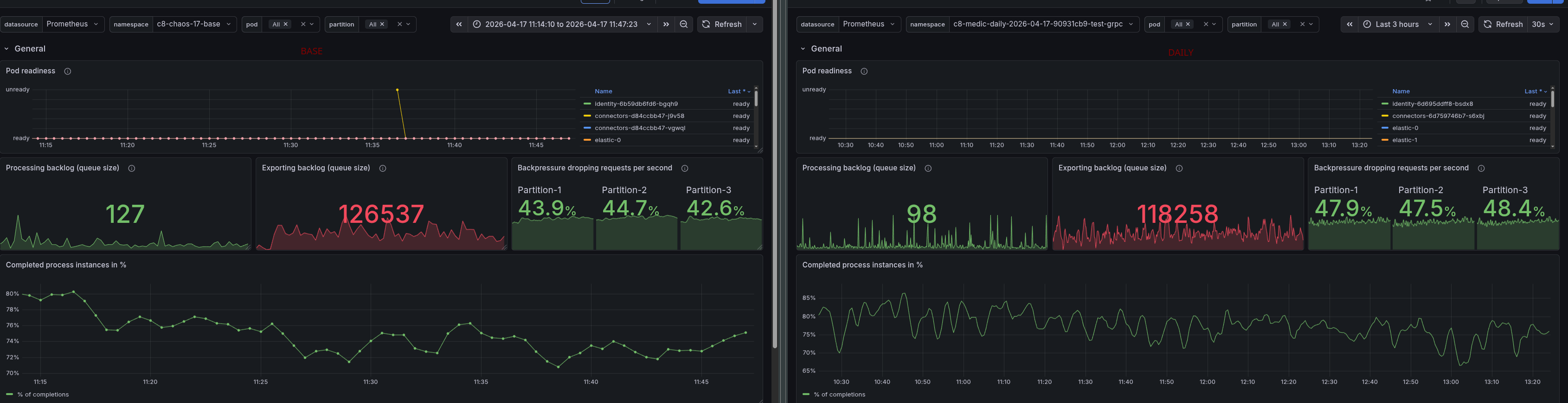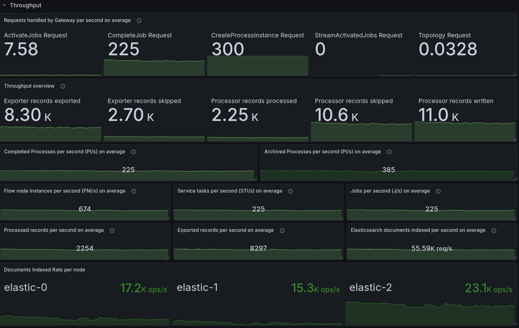 The increased load, first 400 PI/s, later 600 PI/s, produced a bigger processing queue, causing backpressure at the end around ~40-50%. We can see that we are no longer able to complete 100% of the process instances created.
