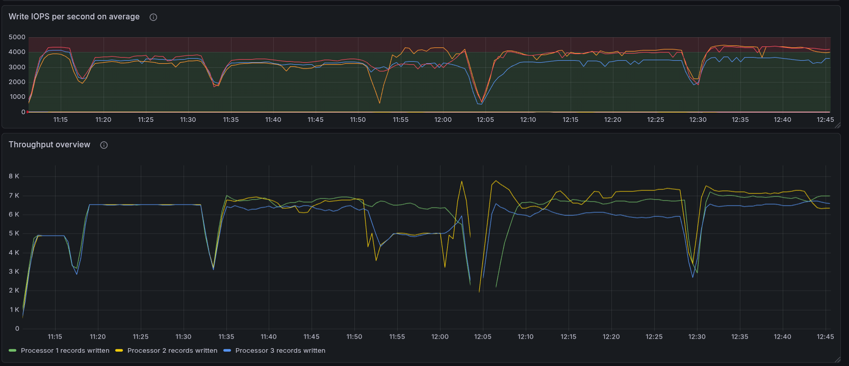 We can see that while we receive 300 PI/s, the cluster with secondary storage is throttled at around 230 PI/s.