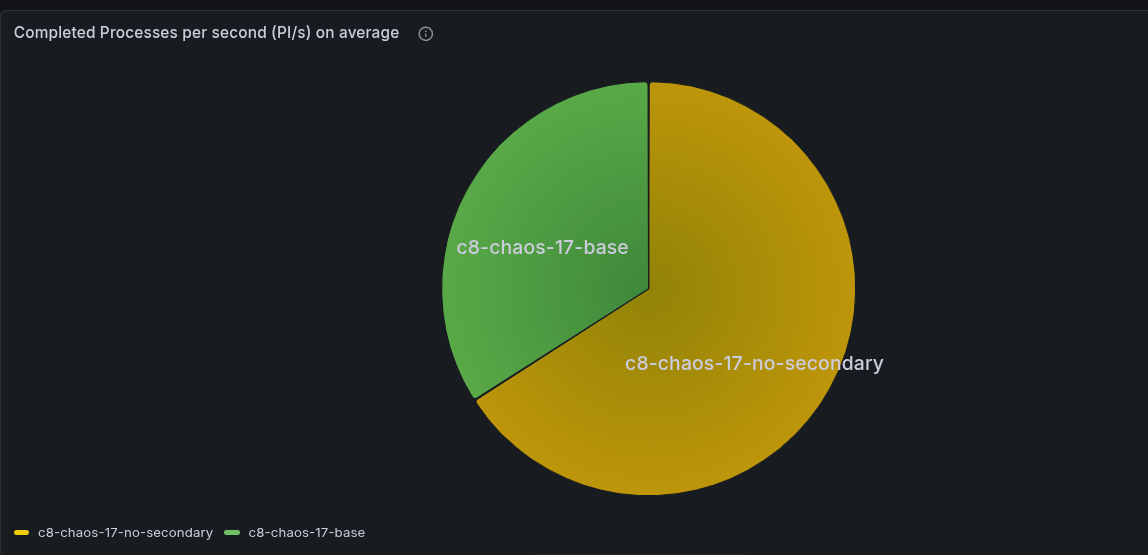We expected that the cluster without secondary storage would perform better, as it would not have to write to secondary storage and would not be throttled by, for example, Elasticsearch (CamundaExporter).